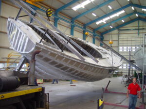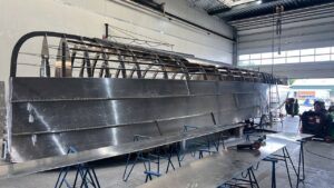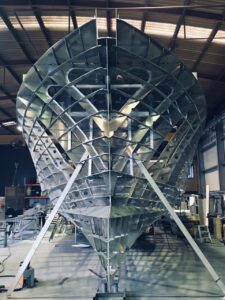 Assembly of hull structures using black steel, stainless steel, and aluminum based on pre-prepared drawings.